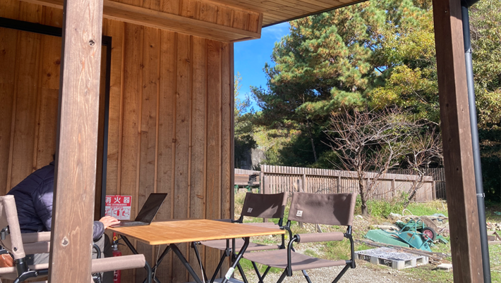 天気の良い日にはウッドデッキにデスクを置き、スタッフがPC作業を行ったりすることもあります♪