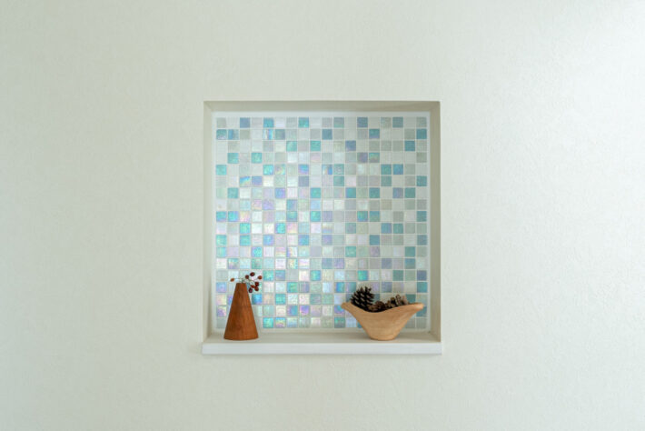 そういったときに、ただ壁に鏡を付けるのではなくて、壁のなかに鏡付きの収納をつけるのが「鏡付きのニッチ収納」です。ちょっとした収納もできて鏡も使えるという、おすすめのオプションです。