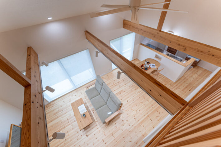 吹き抜けは、上階と下階の床と天井を取り払い、高い天井で開放感のあるスペースを指します。高い天井と広々とした空間が、住まいに明るさと広がりを与え、心地よい居住環境を提供してくれるでしょう。また、自然光が豊富に取り込まれるため、室内が明るくなり、電気代の節約などのメリットもあります。 吹き抜け部分は床がないため、延床面積には算入されません。また、吹き抜けに階段が隣接し、壁がなく手すりのみがある場合、階段部分も吹き抜けと見なされ延床面積から除外されます。