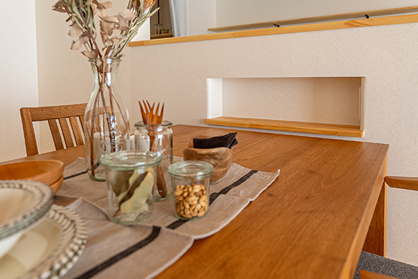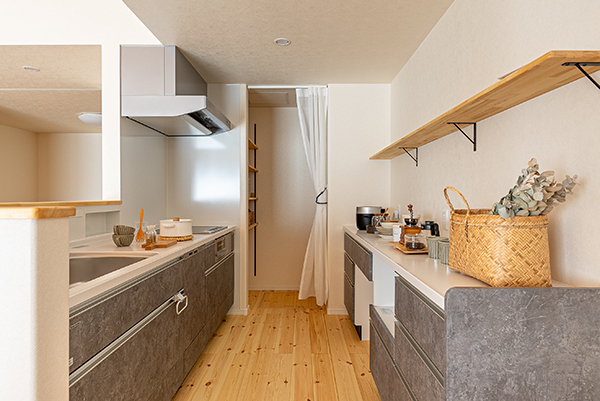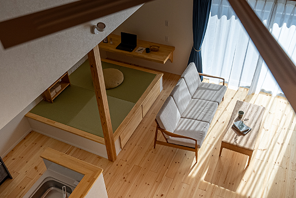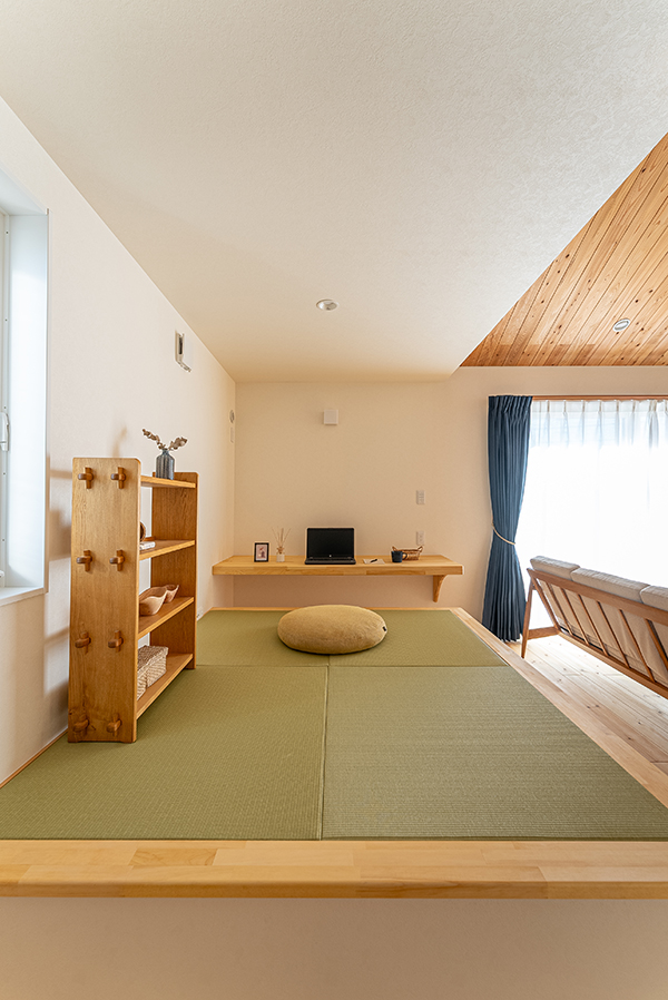 リビングの一角に設けた小上がりの畳スペースは、床下に大容量収納を完備。パントリーや小屋裏収納もあり、物が増えても安心です。