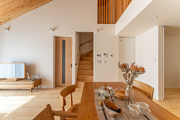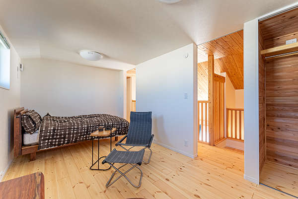 勾配天井を活かした小屋裏収納は、階段でアクセスでき、はしごタイプとは段違いの使いやすさを実現しています。