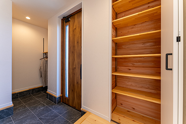 エントランス周りの外壁は、素材の経年美化を楽しむことができる杉板張り。