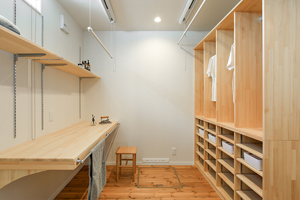 そこで今回は、ガレージから直接シューズクロークへ入り、そのまま脱衣室へ直結する動線を設計。玄関を通らずにお風呂へ行けるため、家に汚れを持ち込まず、快適に過ごせる工夫を施しました。
