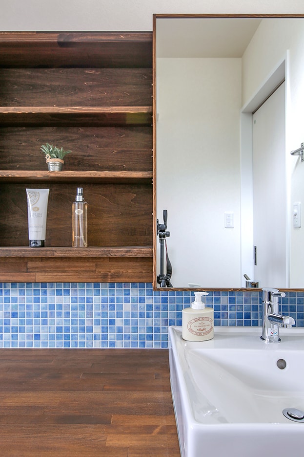 3.5帖ある少し大きめの洗面脱衣室には、家の外観と合ったきれいな青色のタイルで装飾された洗面台があります。この洗面台は既製品ではなく、こういう風にしたいという要望を伺って平松建築で作ったものです。今回はそれなりの収納量が欲しいというのと、将来的に子どもと並んで洗面を使う時など、鏡の位置を変更したいというご要望からこういった形に仕上がりました。