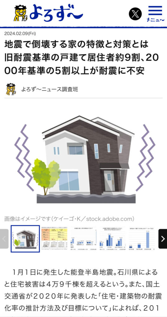 【よろず〜ニュース】地震で倒壊する家の特徴と対策とは 平松建築株式会社のプレスリリースが、よろず〜ニュースに掲載されました。 地震で倒壊する家の特徴と対策とは 旧耐震基準の戸建て居住者約9割、2000年基準の5割以上が耐震に不安 ぜひ、ご一読ください。 よろず〜ニュースに掲載された記事はこちら その他のプレスリリースはこちら