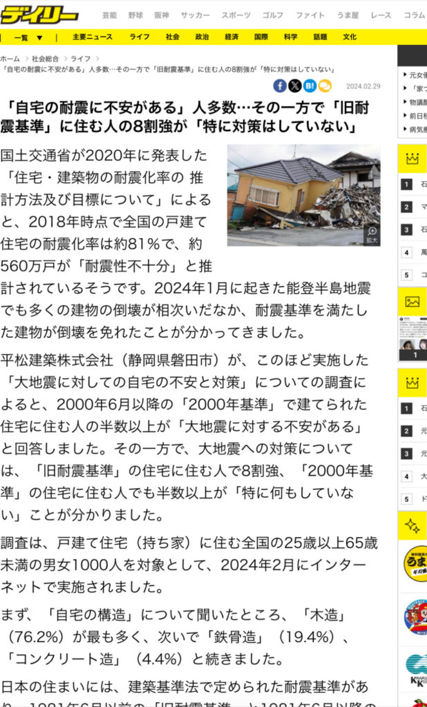 【デイリースポーツ Online】「自宅の耐震に不安がある」人多数…その一方で「旧耐震基準」に住む人の8割強が「特に対策はしていない」 平松建築株式会社のプレスリリースが、デイリースポーツ Onlineに掲載されました。 「自宅の耐震に不安がある」人多数…その一方で「旧耐震基準」に住む人の8割強が「特に対策はしていない」 ぜひ、ご一読ください。 デイリースポーツ Onlineに掲載された記事はこちら その他のプレスリリースはこちら