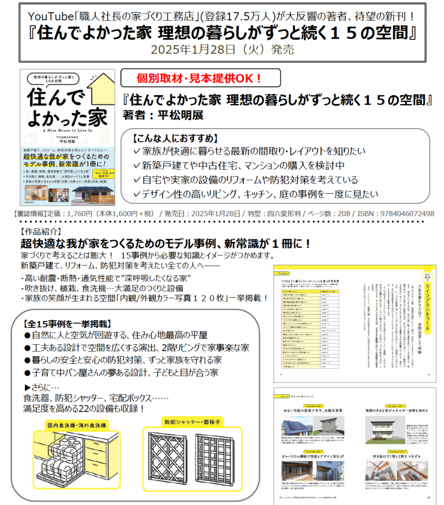 【新刊情報】「住んでよかった家」プレスリリース 好評の『住まい大全』に続く、待望の新刊『住んでよかった家』がついに発売します! 理想の住まい探し、そして快適な暮らしの実現のために役立つ一冊です。 ぜひお手にとってお楽しみください。 書籍の詳細は以下のリンクをタップしてください。
