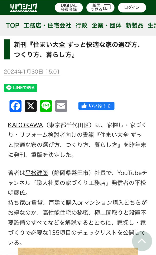【書籍】新建ハウジングDIGITALに掲載されました! 弊社の代表、平松明展が出版した「住まい大全」KADOKAWAの書籍が新建ハウジングDIGITALに掲載されました。 新刊『住まい大全 ずっと快適な家の選び方、つくり方、暮らし方』 ぜひ、ご一読ください。 新建ハウジングDIGITALに掲載された記事はこちら 新刊『住まい大全 ずっと快適な家の選び方、つくり方、暮らし方』 書籍の詳細は以下のリンクをタップしてください。