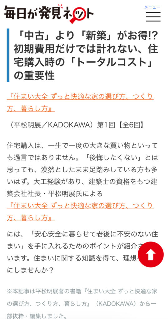 弊社の代表、平松明展が出版した「住まい大全」KADOKAWAの書籍が毎日が発見ネットに掲載されました。