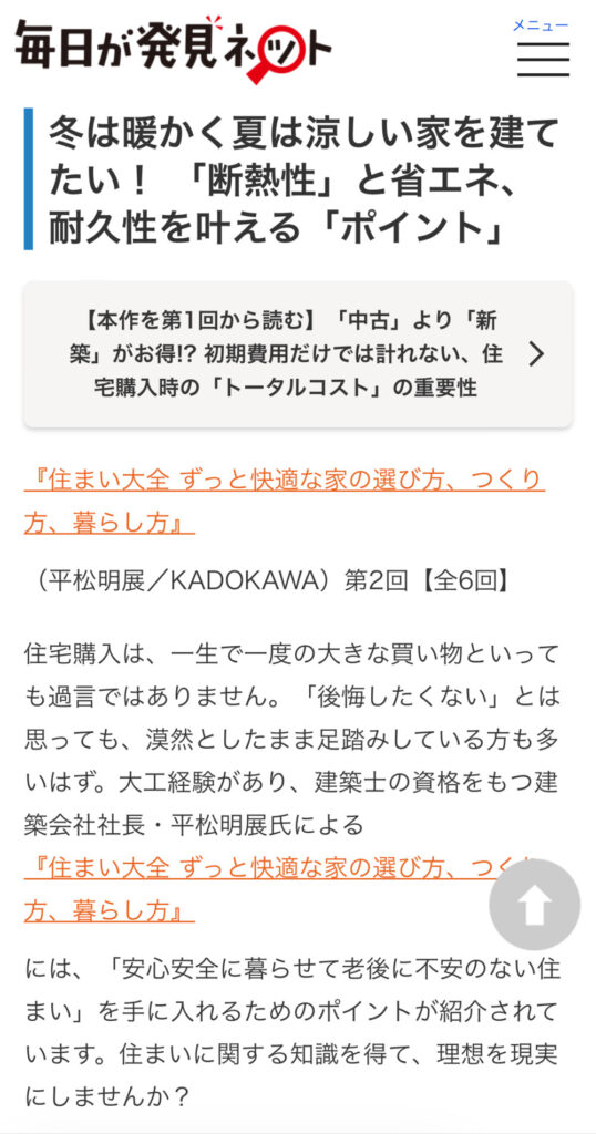 弊社の代表、平松明展が出版した「住まい大全」KADOKAWAの書籍が毎日が発見ネットに掲載されました。