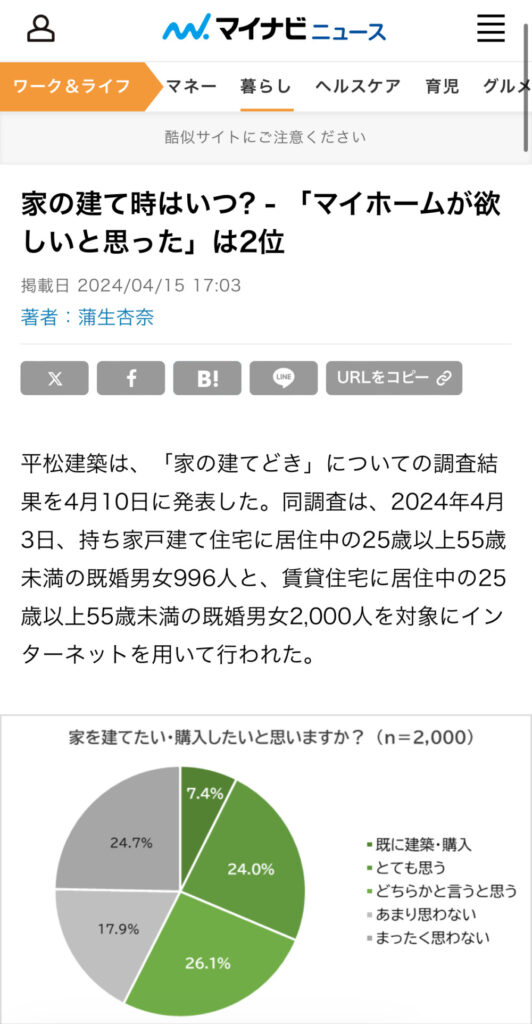 建築資材の価格高騰により住宅価格も高騰しています。そこで、100年後のありがとうを目指し「人と地球と家計にやさしい家」を設計・建築する平松建築株式会社は、持ち家戸建て住宅に居住中及び賃貸住宅に居住中の25歳以上55歳未満の既婚男女全国に「家の建てどき」について調査しました。