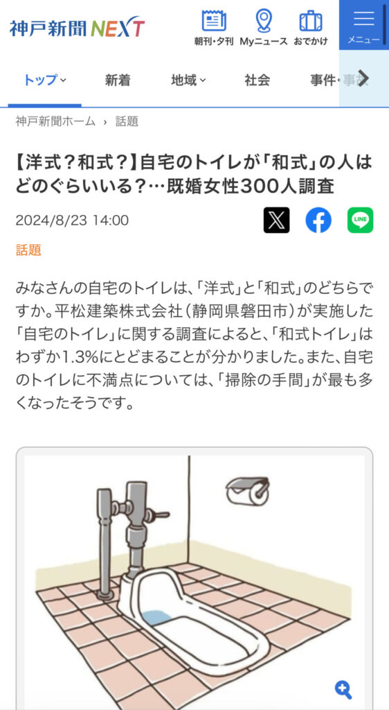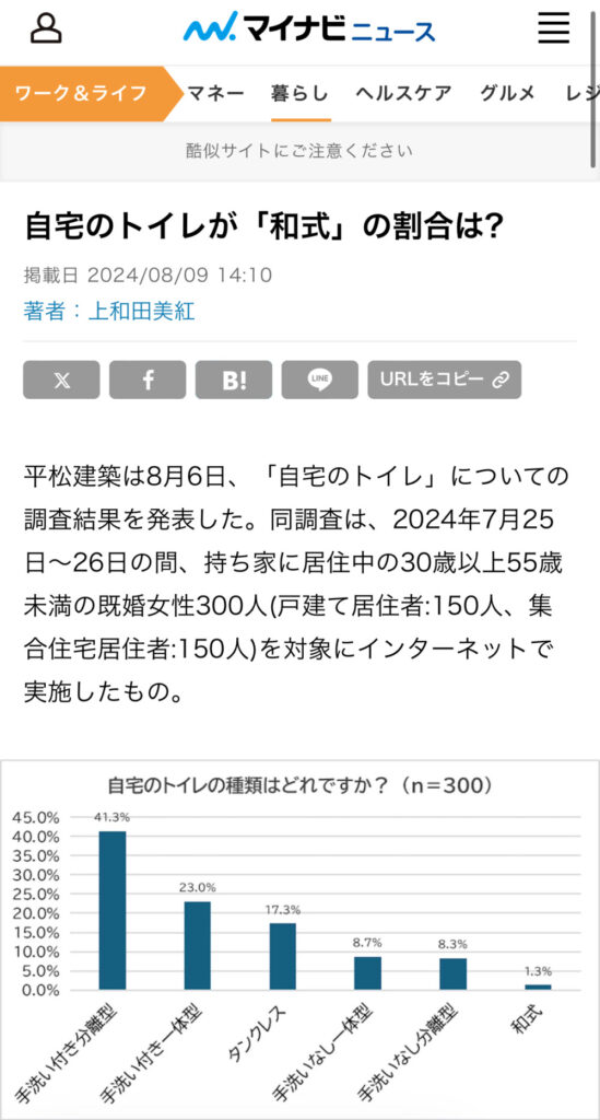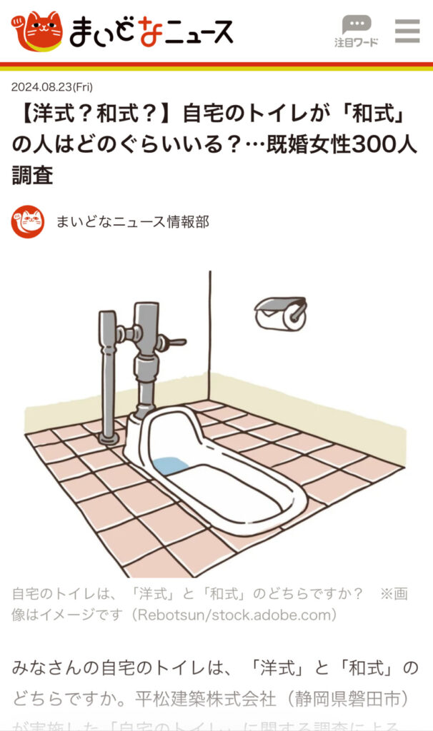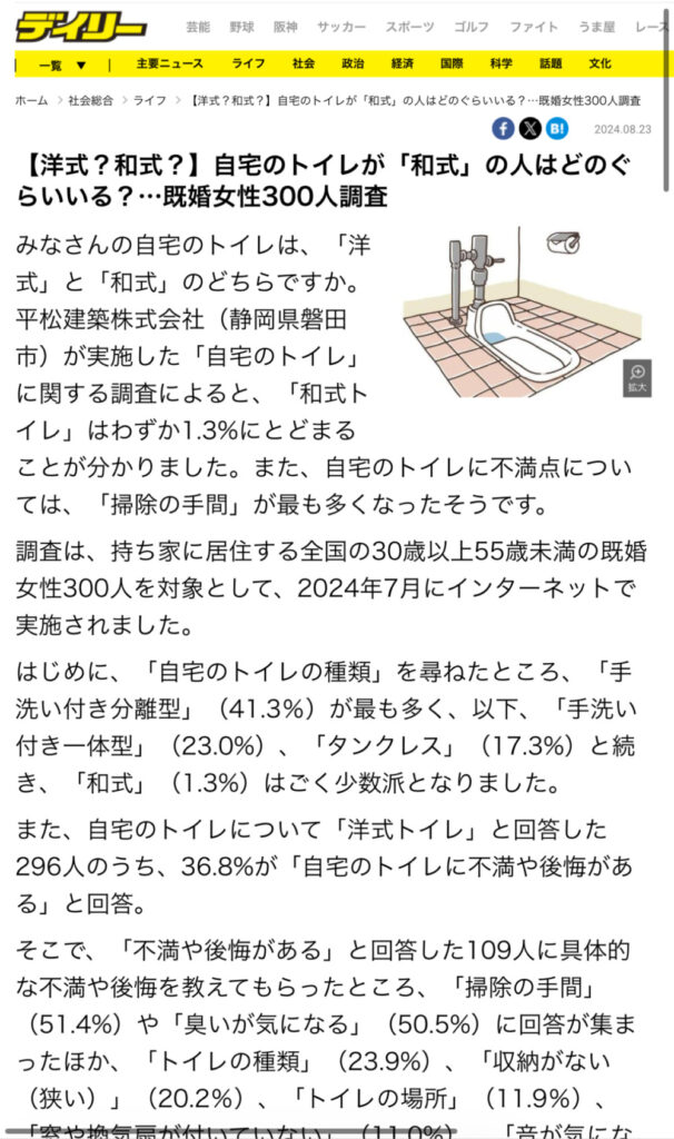 8月10日は「衛陶の日(トイレの日)」(一般社団法人 日本レストルーム工業会制定)です。そこで、登録数14万人突破のYouTubeチャンネル「職人社長の家づくり工務店」の職人社長こと、平松建築株式会社代表の平松 明展は、持ち家に居住中の30歳以上55歳未満の既婚女性全国300人に「自宅のトイレ」について調査しました。