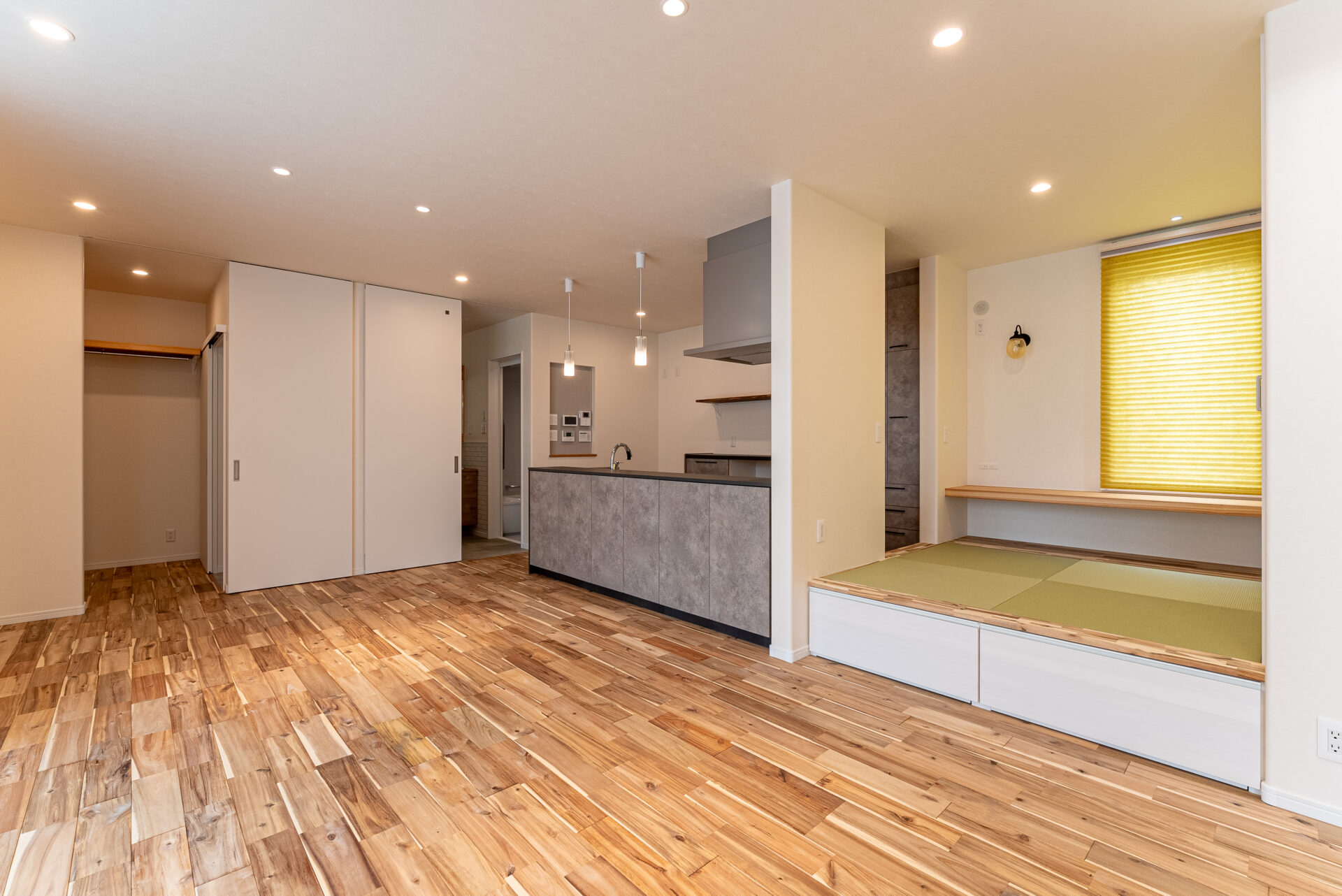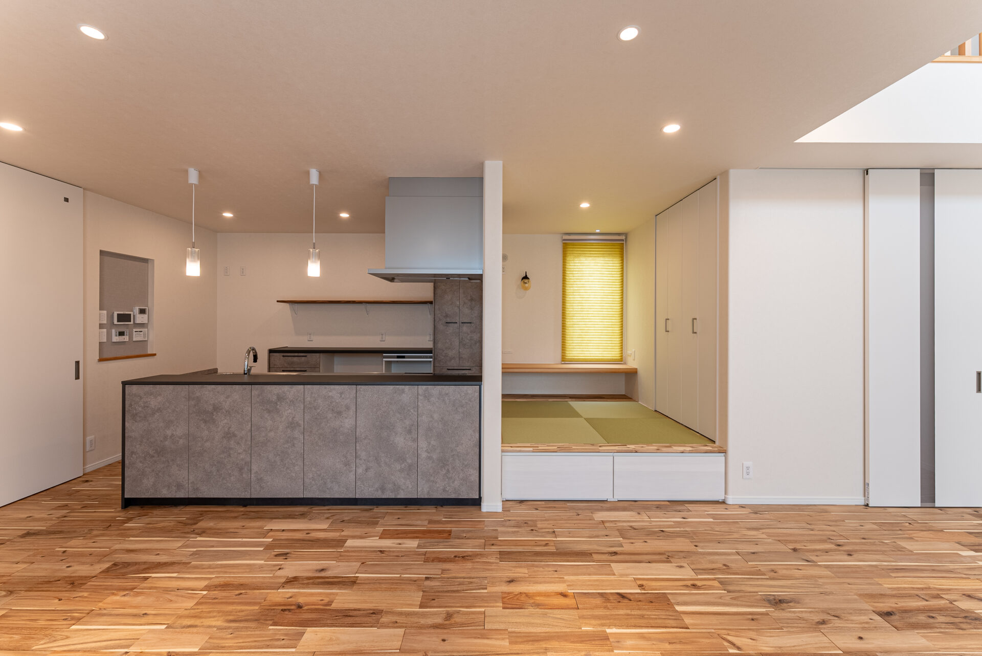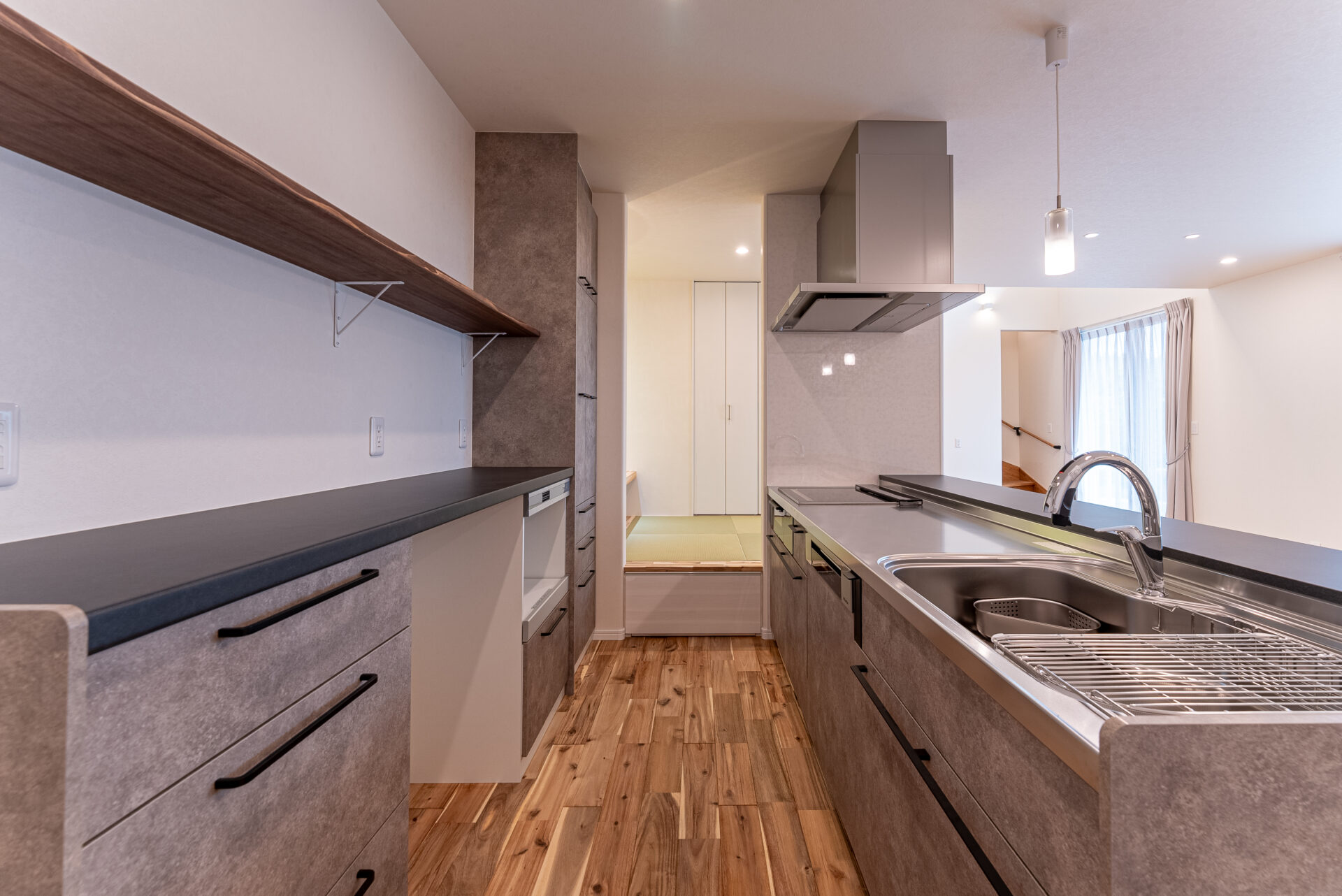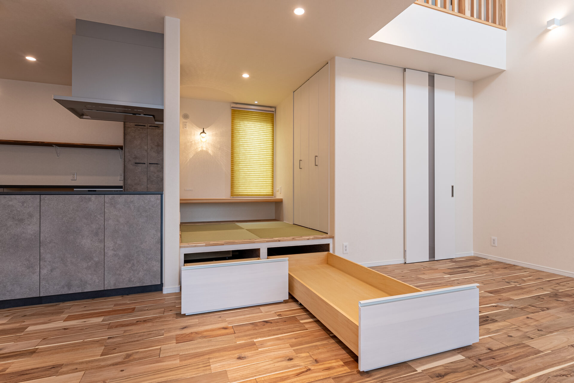 LDKの一角にコンパクトサイズな小上がり和室を設けました。 お施主様の憧れを叶えたゆったりとお茶を飲みながらくつろげる特別な場所です。 小上がり部分には引き出し収納。 なんとキッチンから回遊できるつくりとなっており、キッチン側にも引き出し収納が。 おうちの真ん中の使いやすい位置にたっぷり収納がうれしいですね。