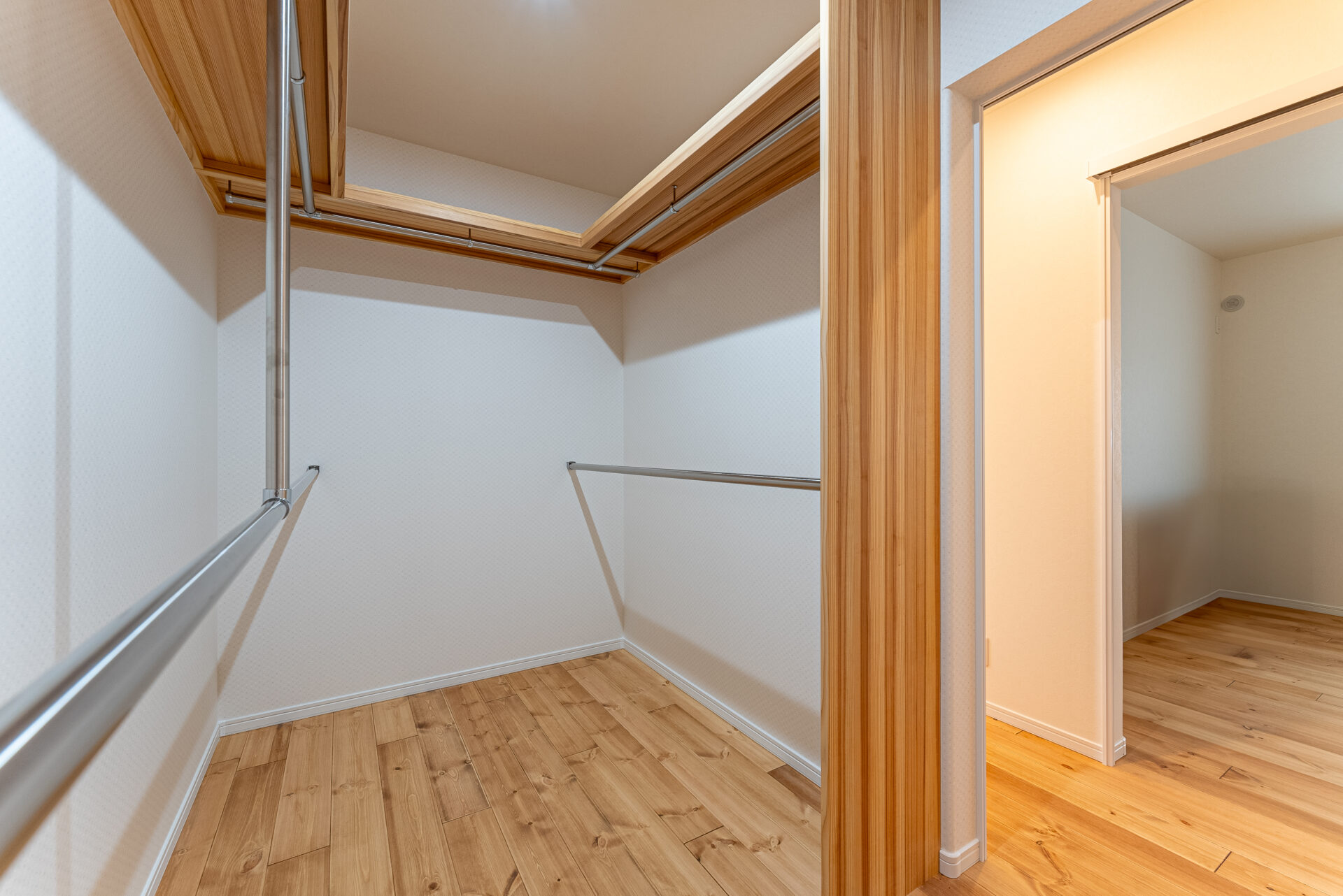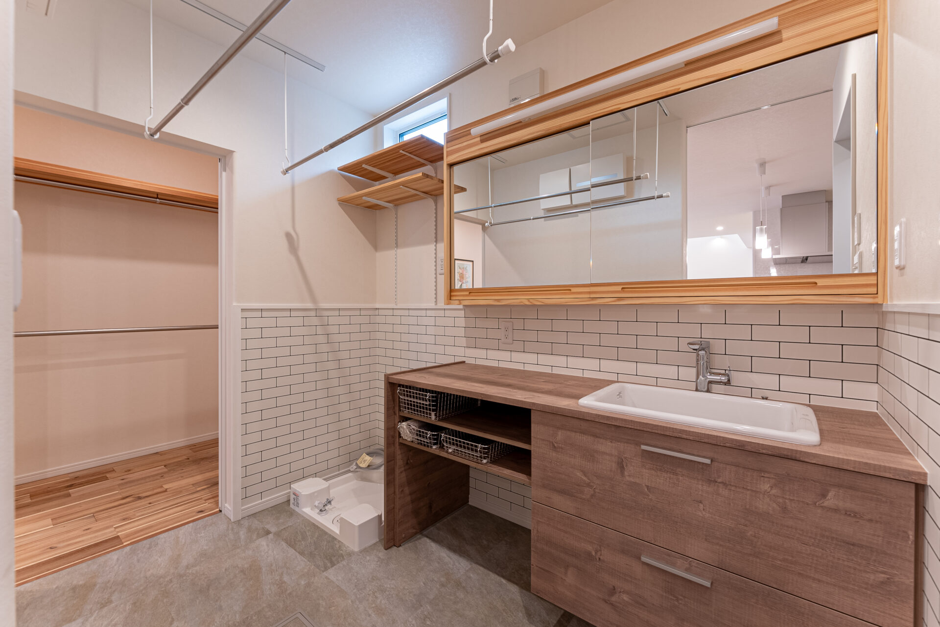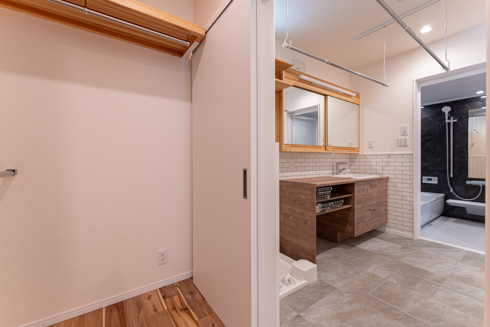 洗面脱衣室兼ランドリールームのすぐ隣にウォークインクローゼット。 洗って干してしまうが一箇所で完結できる快適洗濯動線で、家事にかかる時間を短縮することができます。 時短した分、家族との時間やひとりの時間、趣味の時間に費やすことができ、マイホーム生活がますます楽しくなりそうですね。