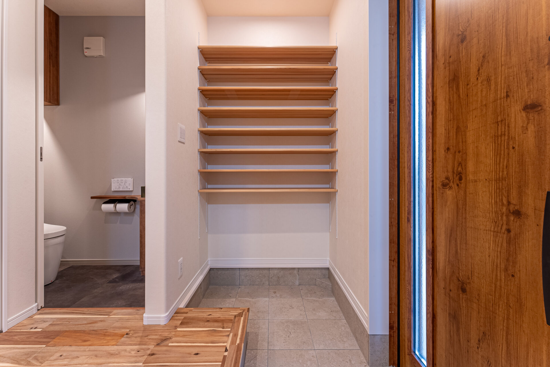 釣具やスポーツ用品、アウトドアグッズなど汚れがちな趣味グッズをしまえる土間収納。 壁にはフックをかけられる有孔ボードを使用。細かいものも仕分けやすいオリジナル収納を作ることができます。