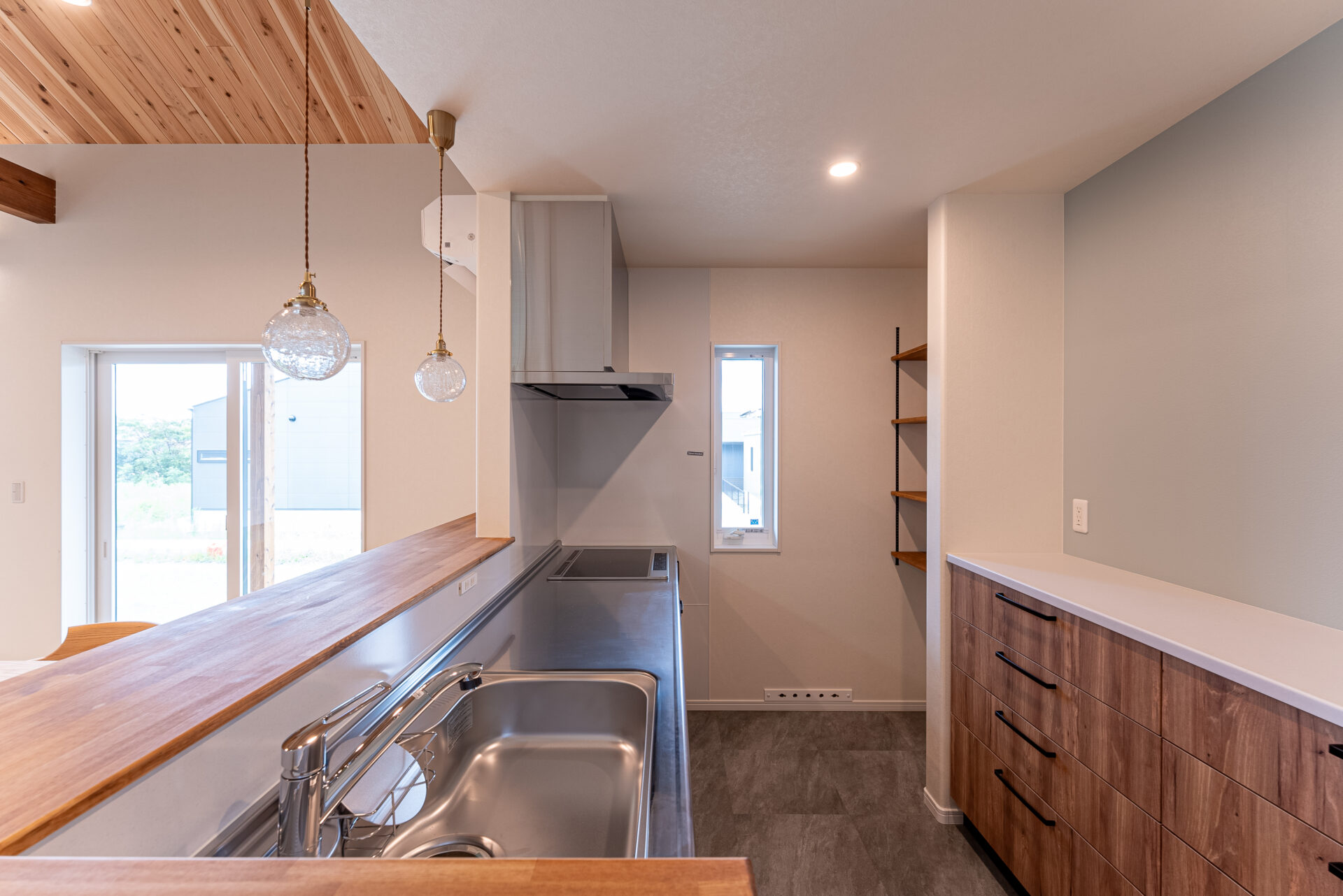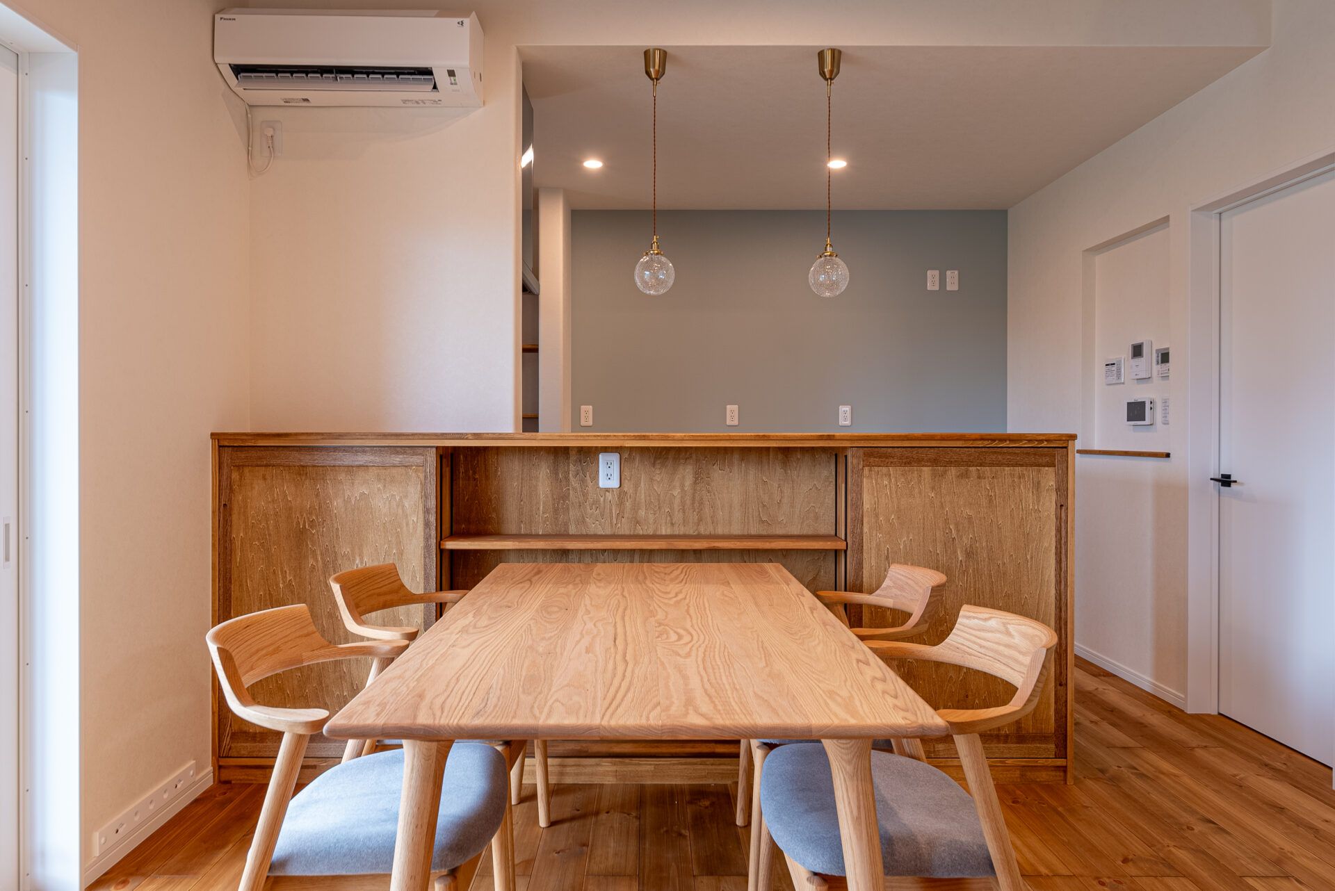 広いLDKをぐるりと見渡せるキッチン。 家事をしながら、和室でお昼寝する赤ちゃんの様子を見守ったり、ダイニングで宿題に取り組む子どもに声をかけたり。 家事と子育てを楽しく両立できる設計です。 淡い水色のアクセントクロスと温かみのある木目の造作棚が、 カフェのようなおしゃれな空間を演出しています。
