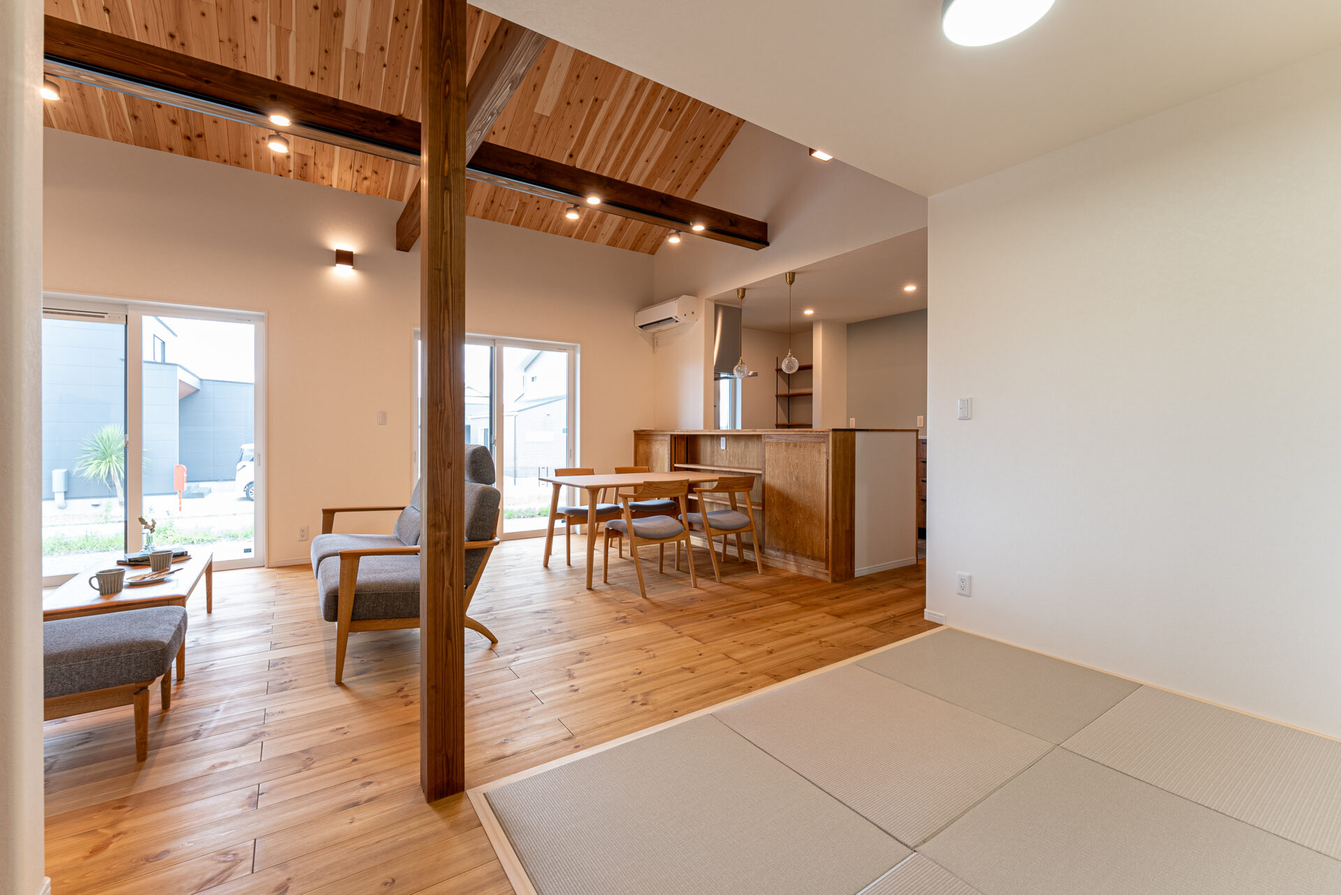 無垢材と自然塗料に包まれたLDK、フラットにつながる和室、