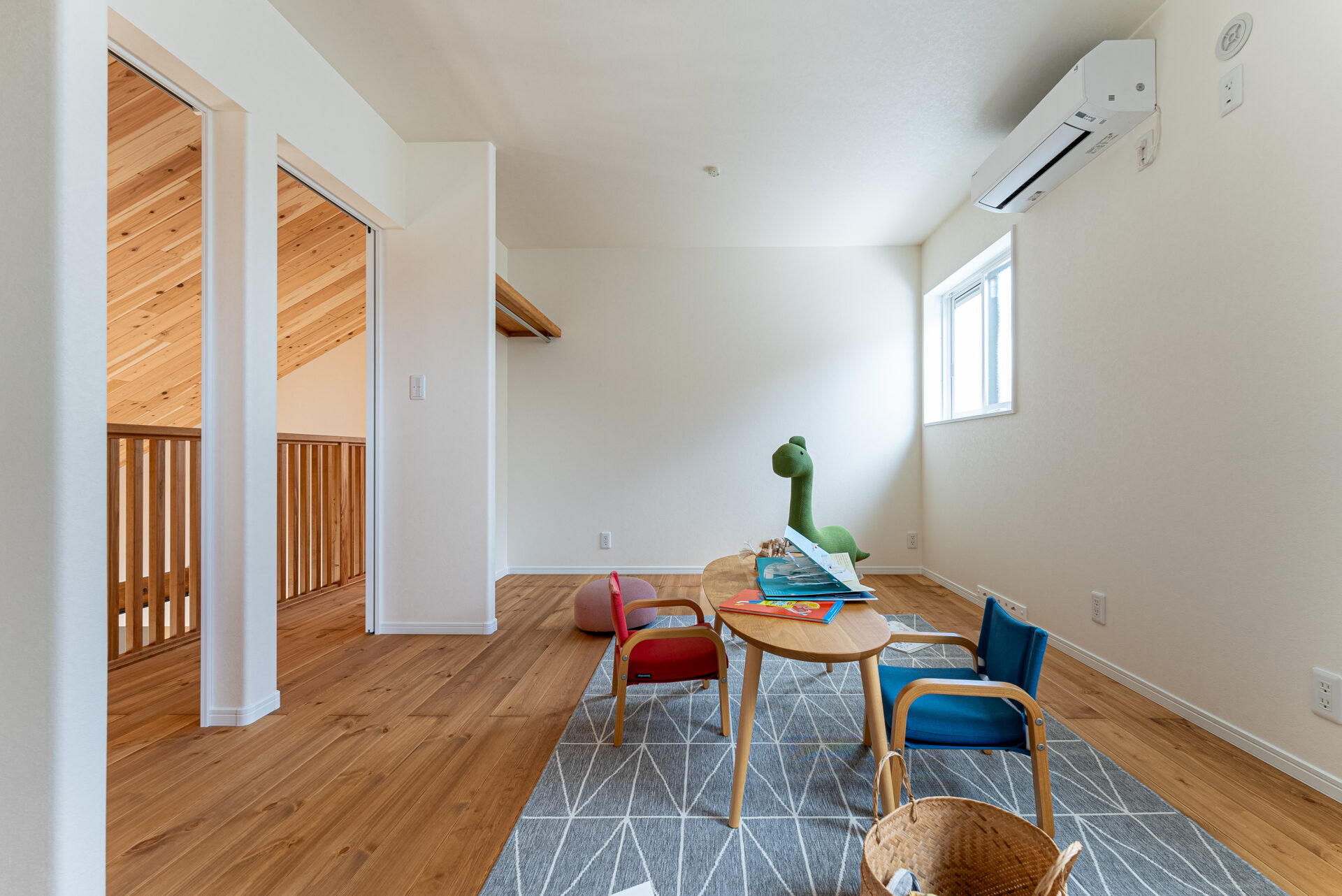 リビングと段差ゼロでつながる和室は、遊び場にも、ごろりとくつろぐ場所にも最適。 壁面には、たっぷりの収納を設けました。 子どものおもちゃもすっぽり収まり、LDKを常に美しく保つことができます。