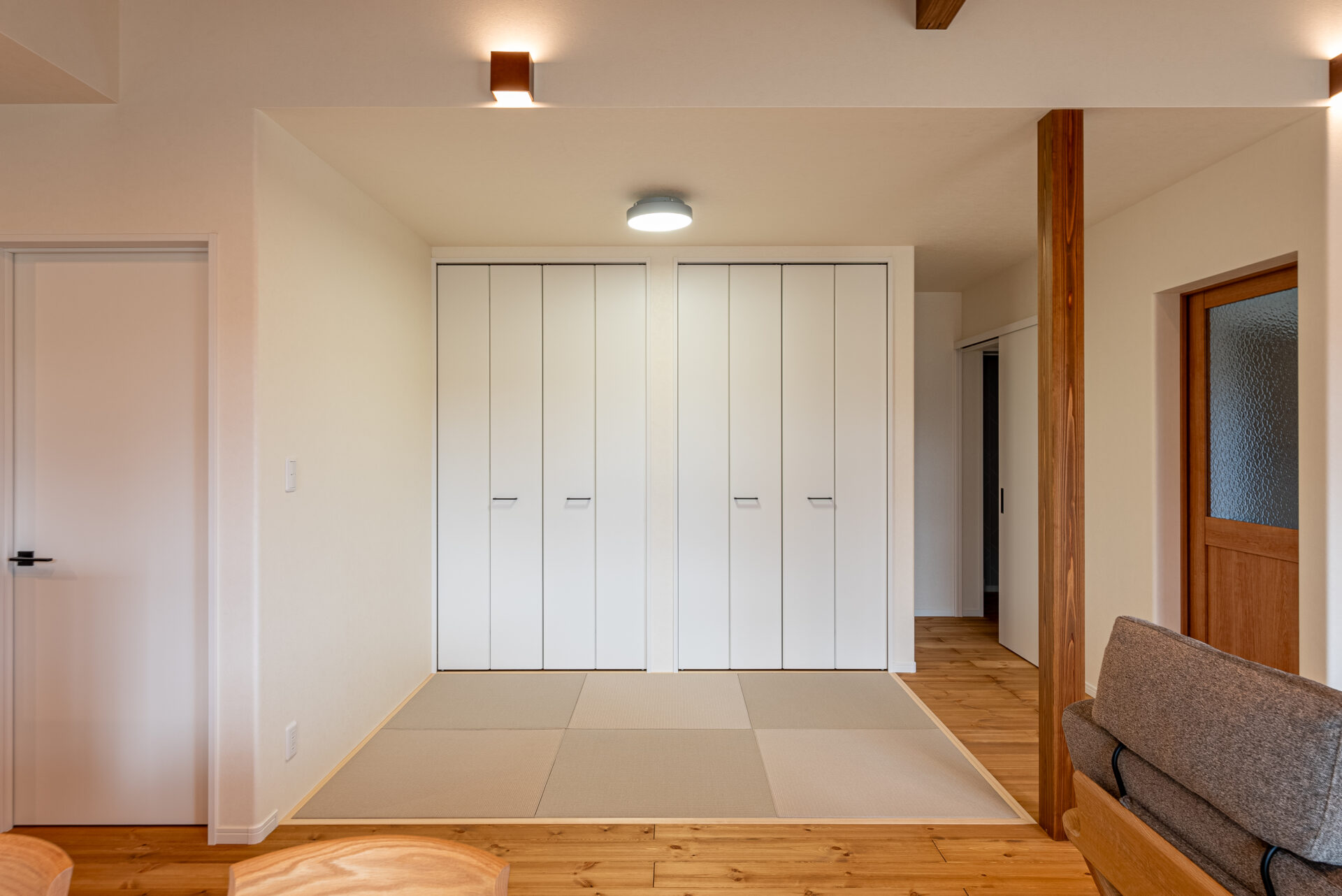 フラット和室はリビングと段差ゼロでつながり、お昼寝スペースにも遊び場にも、自然と使い方が生まれてきます。