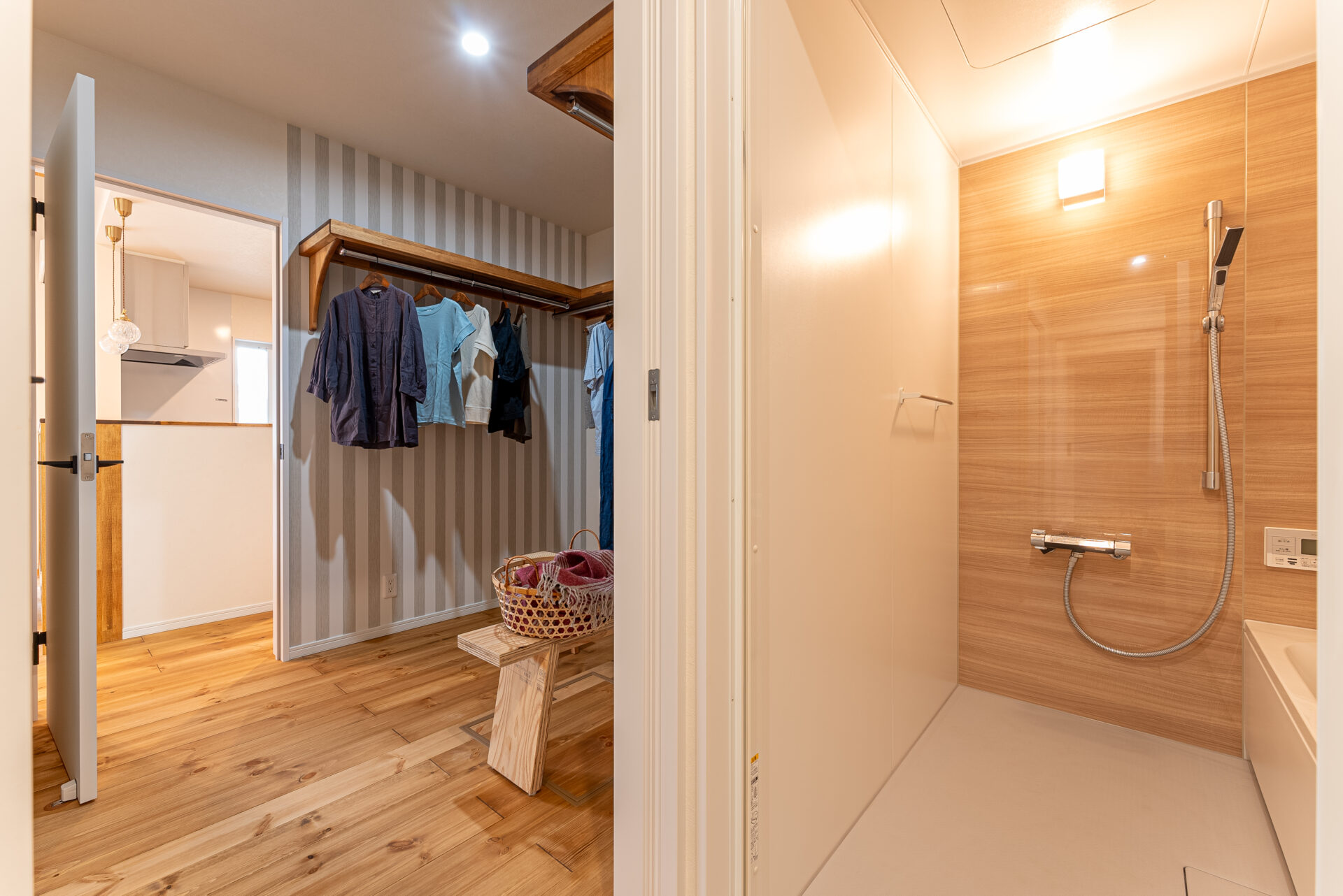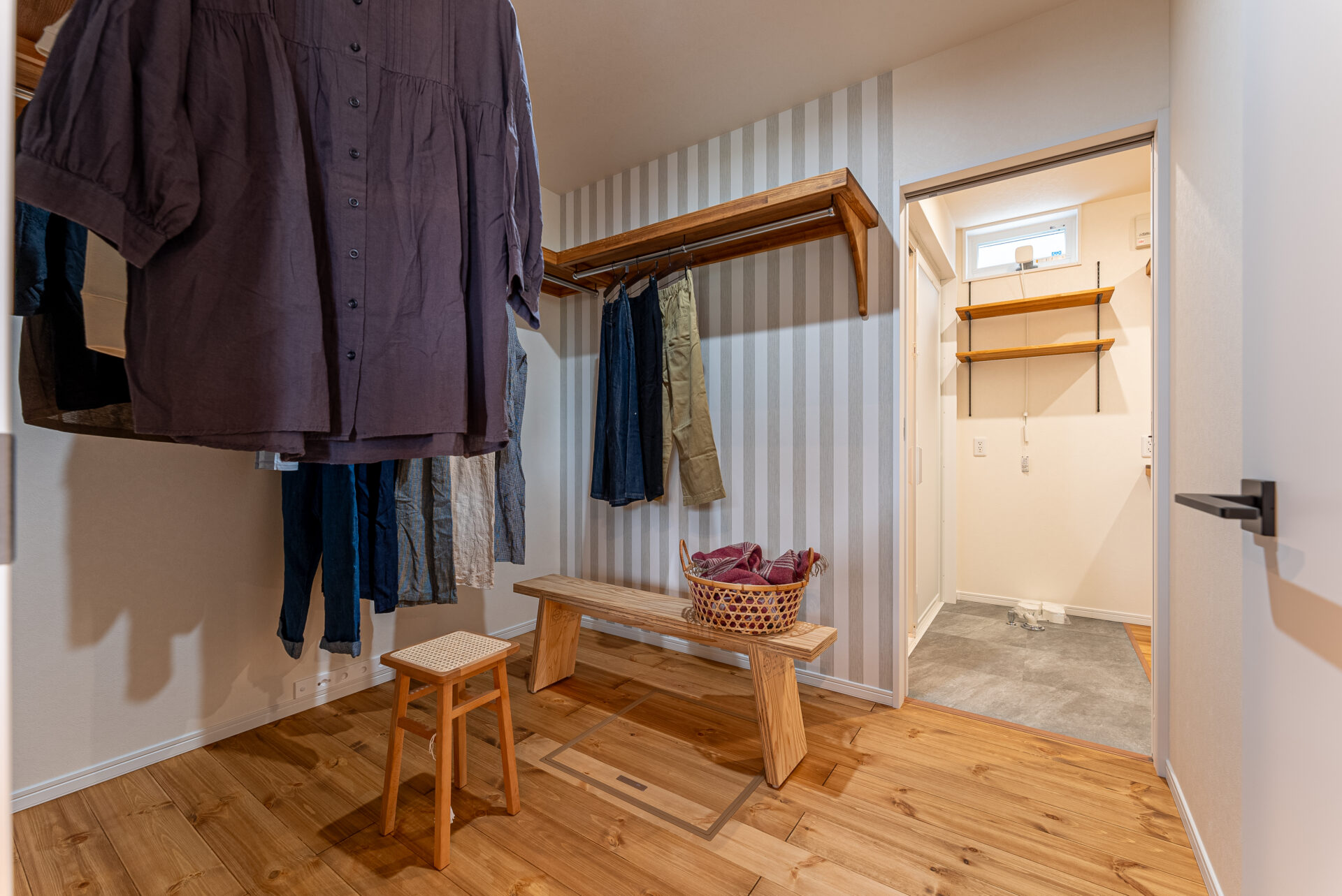 脱衣室にその場で干せる室内干しアイアンバーを設置。 タオルをたたむのに便利な造作カウンターも。 洗ってその場で干せる、乾いたものはその場でたためる快適ランドリールームです。 さらに、ランドリールームの隣にはウォークスルーできるファミリークローゼットを配置しました。 乾いた洗濯物をそのまましまえる便利な洗濯動線です。
