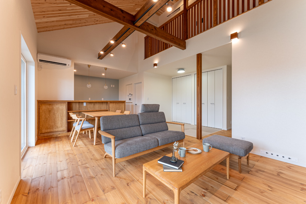 リビングの床材は、平松建築の標準仕様である無垢材+自然塗料。