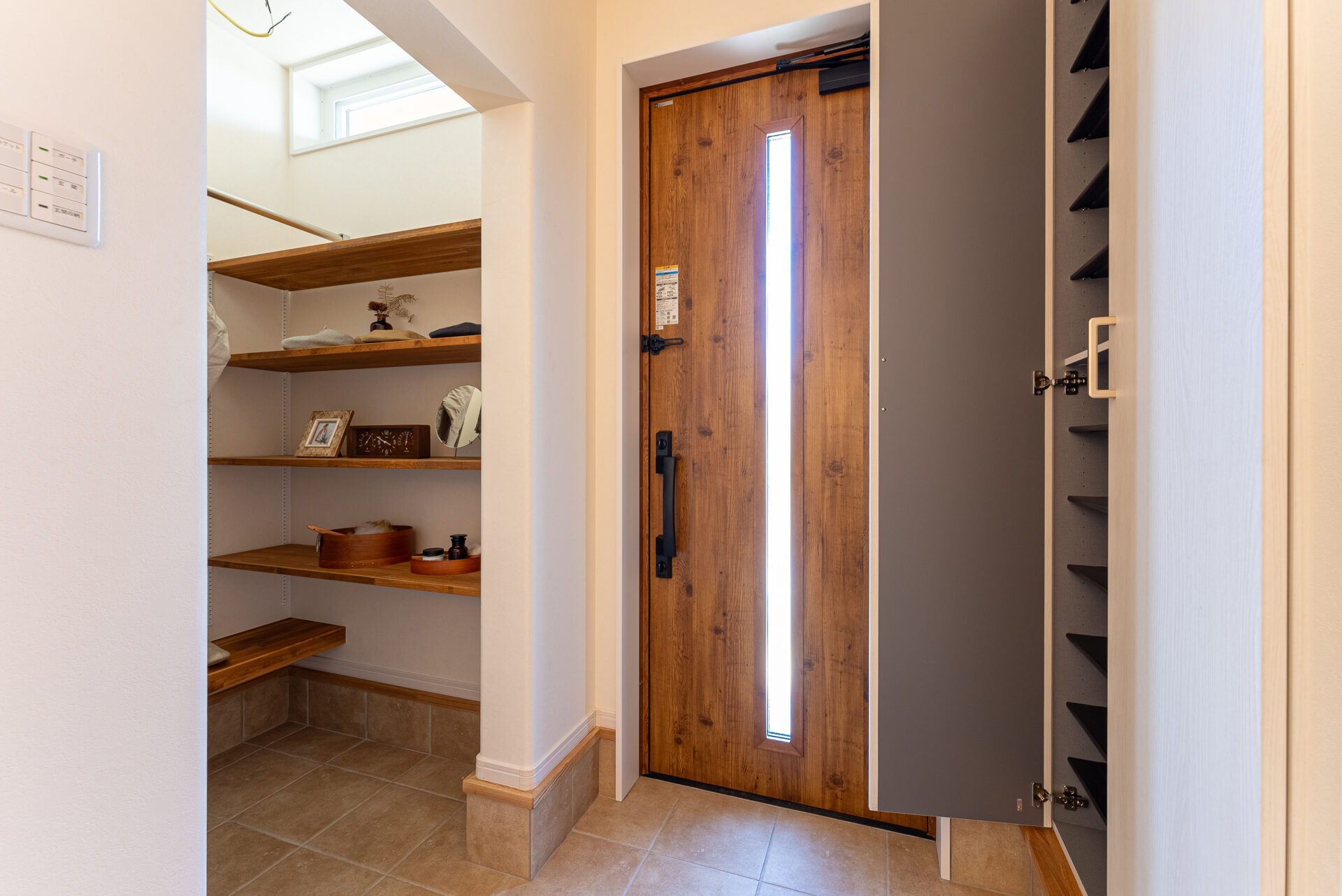 冷凍庫と冷蔵庫を置いてもなお余裕がある広々パントリー。 L字型に設置した可動棚が収納の自由度を広げます。 玄関とキッチン、どちらからもアクセスできる動線設計で日々の家事がもっとスムーズに。 お客様からは見えない配置でスッキリとした空間を保てます。