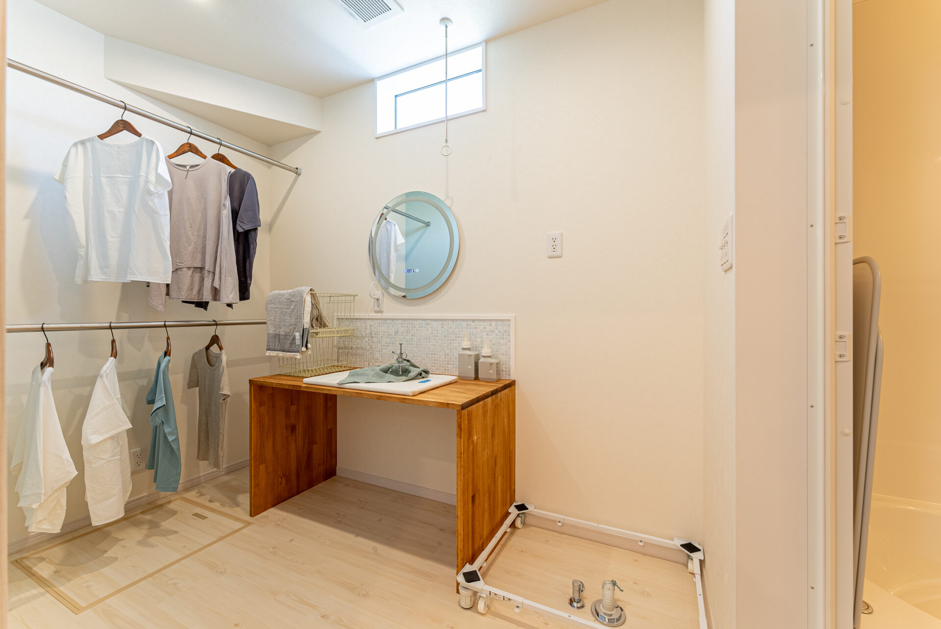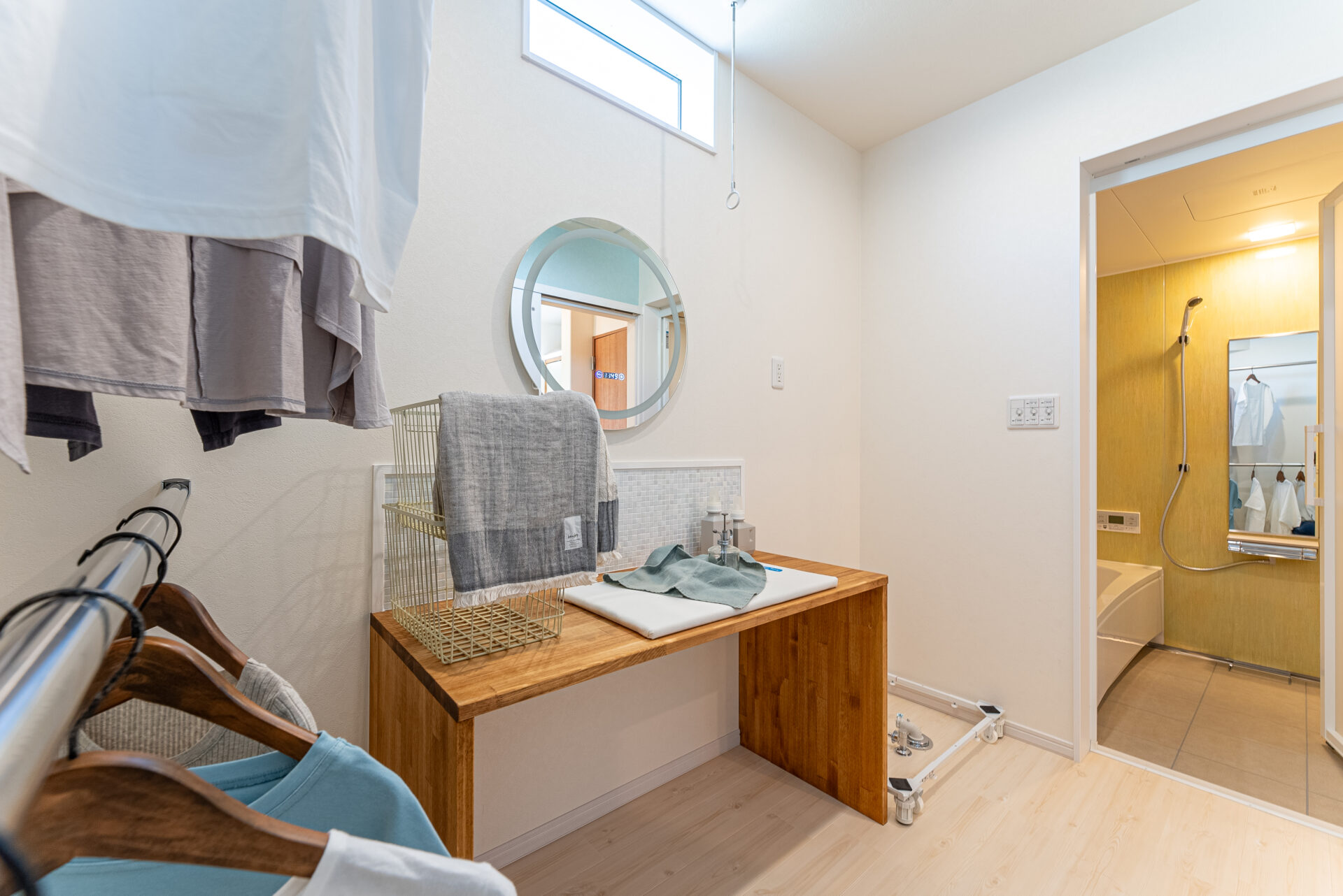 脱衣室にその場で干せる室内物干しを設置。 造作カウンターはタオルなどをたたむのにも便利です。 さらに、ハンガーのまま移動させるだけで片付けが完了する2段のパイプも設置しました。 洗ってその場で干せる、乾いたものはその場でたためる・しまえる快適ランドリールームです。