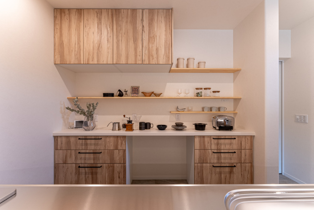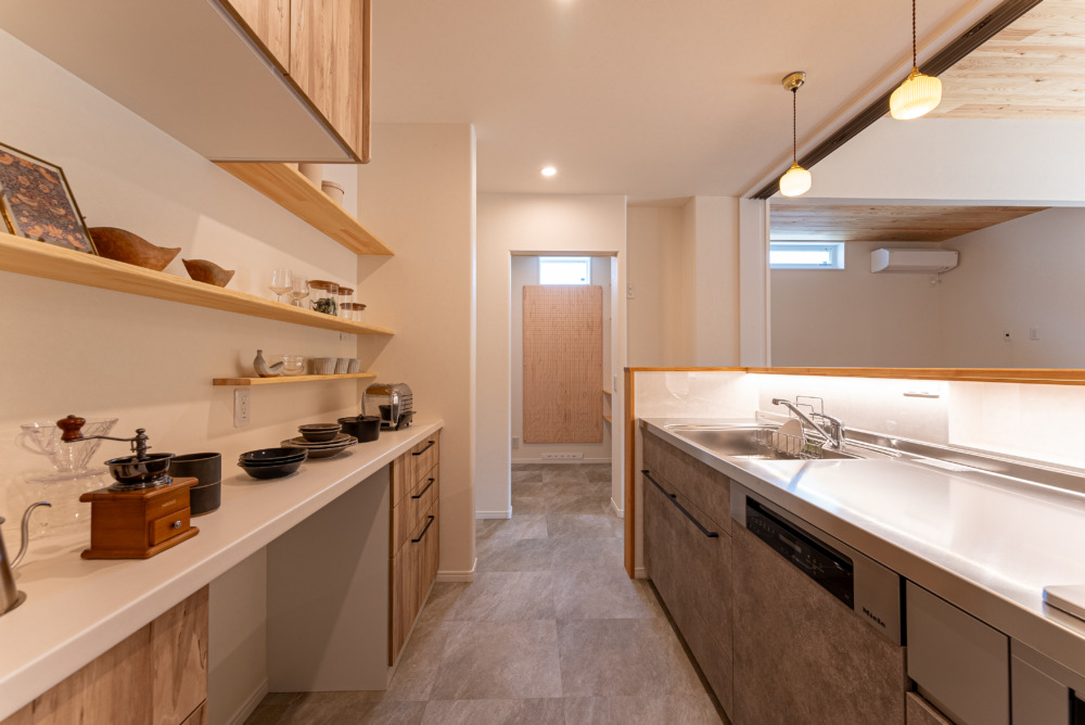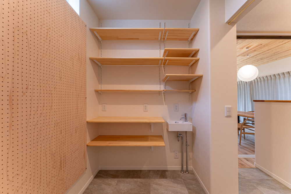 パントリー内に手洗いを完備。 可動棚と固定棚で使い分けたり、有効ボードを使ってオリジナルの収納を作ったり。 日用品や食料のストックから普段使いのものまでたっぷりしまえるゆとりある空間です。